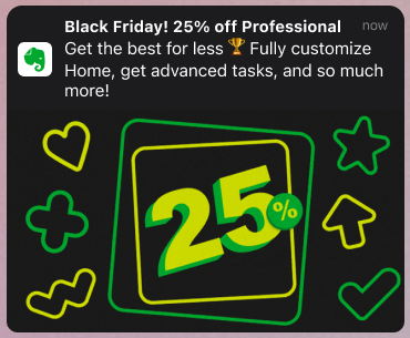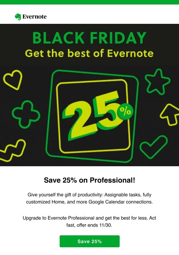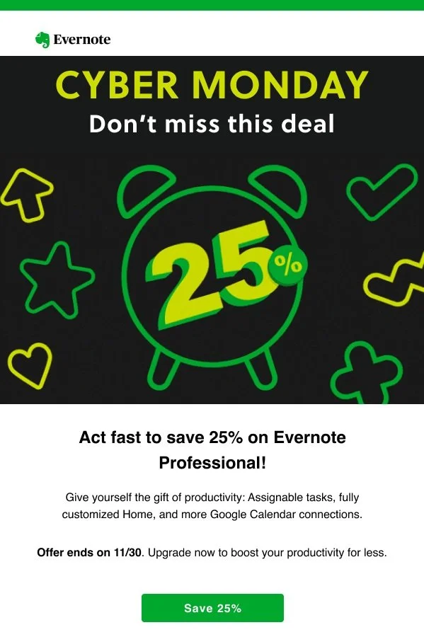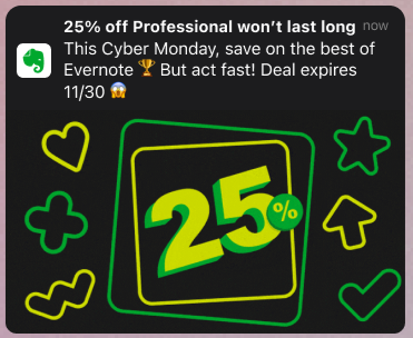 At this time of year, we were competing with tons of other Black Friday promotions. So I got stakeholder buy-in to make our campaign copy as short and glanceable as possible—driving users with even the shortest attention spans to the big green button faster.