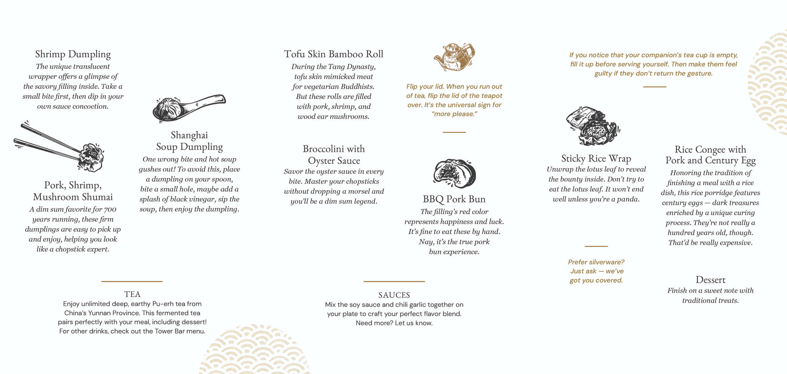 How do you get people to attend a pricey dim sum meal and leave satisfied, even if their tastes are a little white bread? Pique their interest, evoke a sensory experience, and make them feel like a culinary expert.